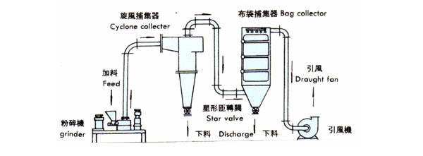 粉體中大于臨界直徑(分級(jí)粒徑)的顆粒因質(zhì)量大,被甩回粉碎室繼續(xù)粉碎,小于臨界直徑的顆粒經(jīng)出料管進(jìn)入收集系統(tǒng)。