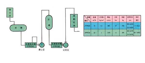 在聚氯乙烯糊狀樹脂生產(chǎn)線中使用JYW250,JPW150乳漿粉碎機(jī),可使聚合所產(chǎn)生的大量塊狀樹脂被粉碎成產(chǎn)品,從而大大提高了糊樹脂得率,同時(shí),還避免在下道工序噴霧干燥中,經(jīng)常發(fā)生的堵料現(xiàn)象,對(duì)提高產(chǎn)品質(zhì)量,簡(jiǎn)化工藝流程,降低能耗,及生產(chǎn)成本方面有顯著經(jīng)濟(jì)效益。